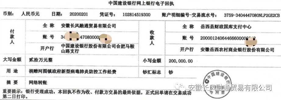 2025年10月31日时值新冠肺炎重大疫情发生之际,2月1日长风融通董事长刘绍东先生宣布向安徽省岳西县河图镇新冠肺炎防控指挥部捐赠20万元,用于支援河图镇疫情防控工作;与此同时长风融通参股企业也积极支持企业驻地抗击疫情工作
